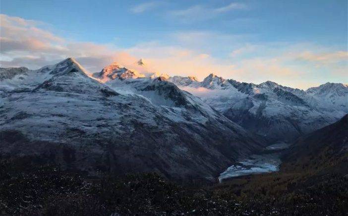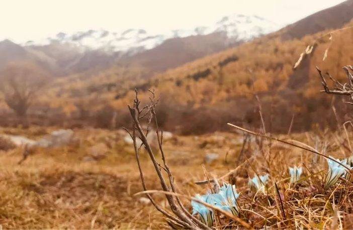 惊喜是在过了打尖包后发生的。最后的一段路,是在山腰间不停地横切,几乎每天都走,但是这一天接近傍晚时分,天气突然放晴了,前所未有的晴朗,弥漫了好几天的乌云消散殆尽,天空显出它湛蓝的本色,残余的几抹灰白色的云,也只敢低低地依附在山头。黄昏的阳光自然是柔和的,轻轻地打在山峦间,铺在斜坡的草地上,把吃草的牦牛们的影子拉得又细又长。大地的颜色好看极了,金黄色的草地,金黄色的山林,跟白色的雪峰和蔚蓝的天空相映成趣。那一刻,我的头疼也好了大半,我便借着等开花的机会,呆呆地坐了好久。