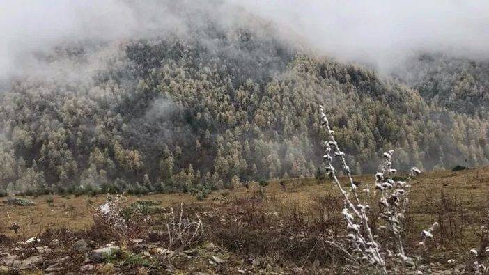 都是因为那阴冷的天气。虽然没有下雨下雪,天空总是布满了灰色的云层。从我们居住的长坪村,可以清楚地看见对面山坡上的金黄色树林,往峡谷的方向望,远处的天空却一直覆盖着厚厚的云层。你们躲在云海里,养在深闺人未识。