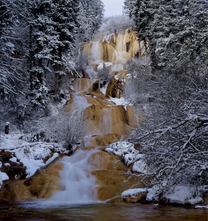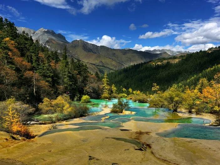 从黄龙沟口拾级而上,巨龙的脊背蜿蜒起伏,无数滩流、瀑布湍湍而下,仿佛龙掌戏水;满山艳丽的杜鹃花、火红的枫叶、金光闪烁的毛茛,与色彩斑斓的大小彩池交相辉映,点缀出巨龙的奕奕神采。