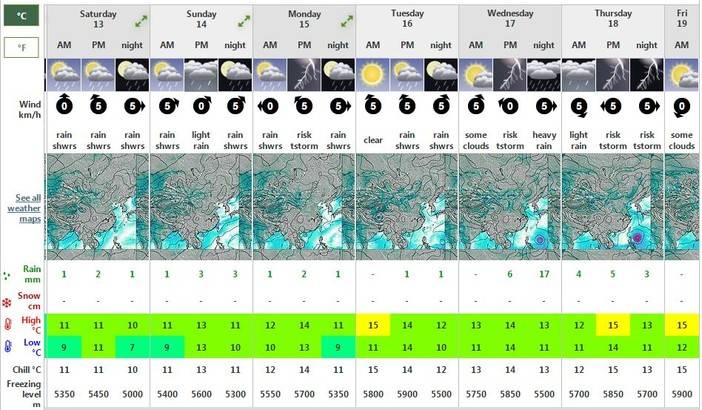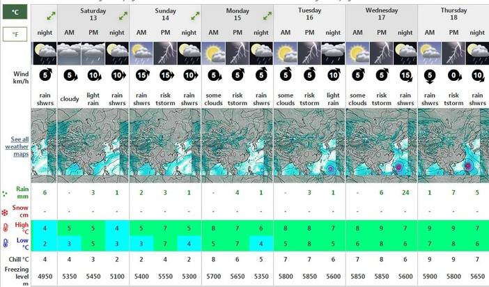 我们本次的天气数据采用了专业的山地天气预报网站mountain-forecast.com的数据,它几乎覆盖了世界是所有有命名的山峰,可以通过搜索山峰名称,获得不同攀登时间,早中晚不同时段的温度、风速、降雪、雪线等参数。虽然天气预报不一定完全准确,但我们可以获得有价值的参考信息。