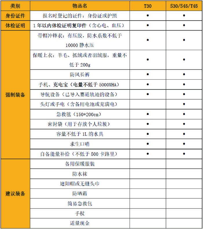 因夹金山越野挑战赛的赛道海拔在2800-4200米之间,属高海拔地区。参赛队员需要提前对高海拔环境适应,才能让身体更好地进入比赛状态。因此,建议运动员提前1~2天报到。比赛时间虽然是6月初夏,但高海拔山地气候变化无常,山上大风,降温和降雨/降雪都有可能发生,因此我们需要运动员准备防风、防雨、保暖等强制装备。