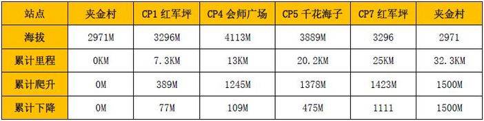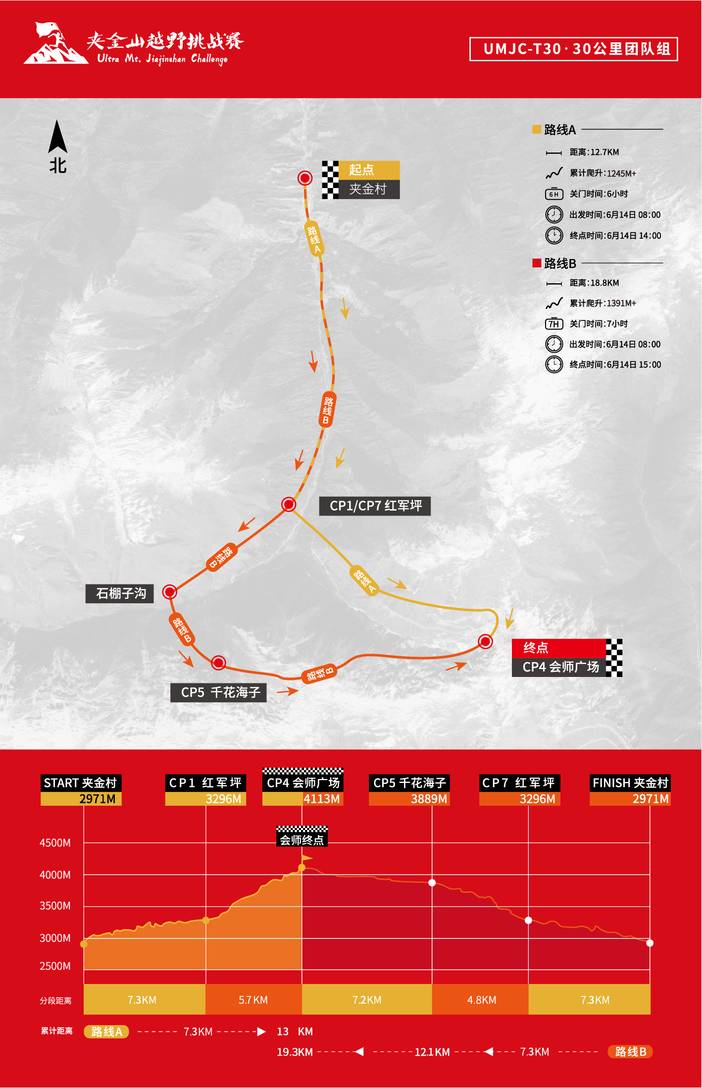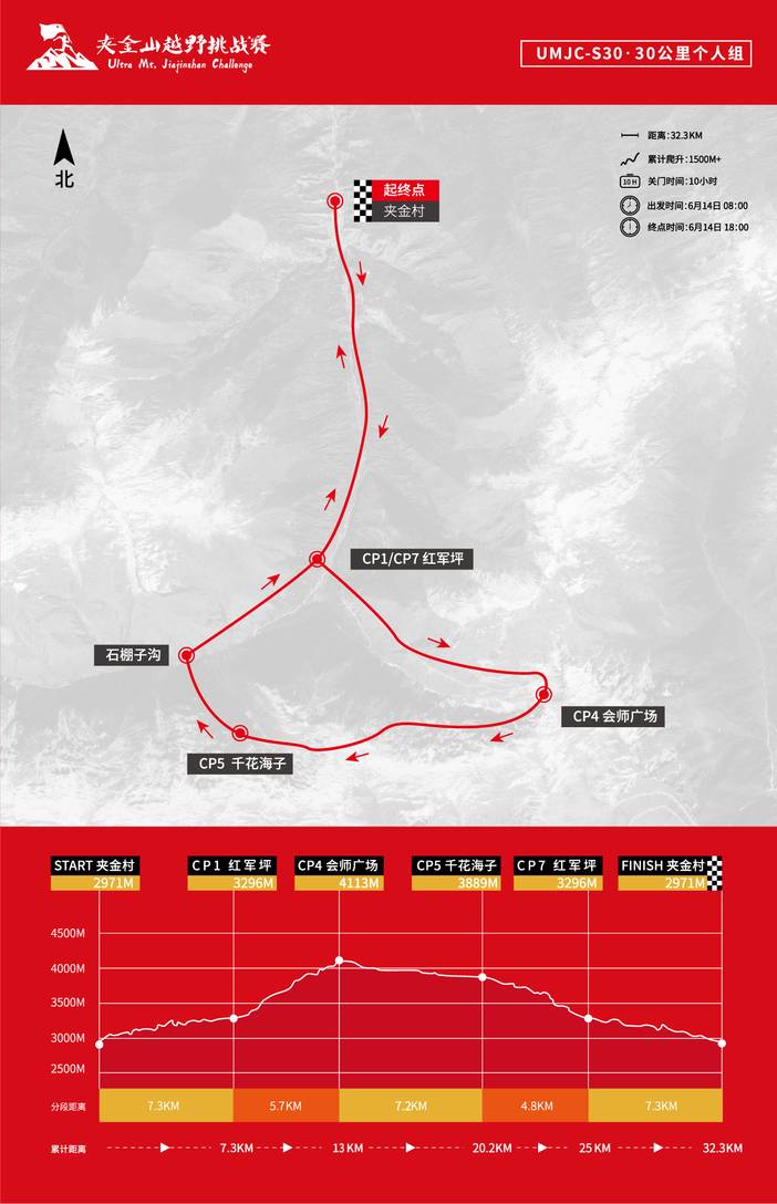 赛道简介:UMJC-SOLO 30 (30公里个人组)线路全长32.3 公里,累计爬升 1500 米,累计下降 1500 米 赛道最高海拔 4194 米,最低海拔2971 米,平均海拔 3630米 ,起终点海拔 2971米,全程共计 4 个补给站点(不含起终点) 。赛道走向:夹金村(起点)CP1红军坪→ CP4会师广场→ CP5千花海子→ CP7红军坪→夹金村(终点)。(注 CP1 和 CP7为往返经过同一站点)