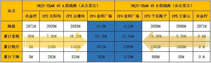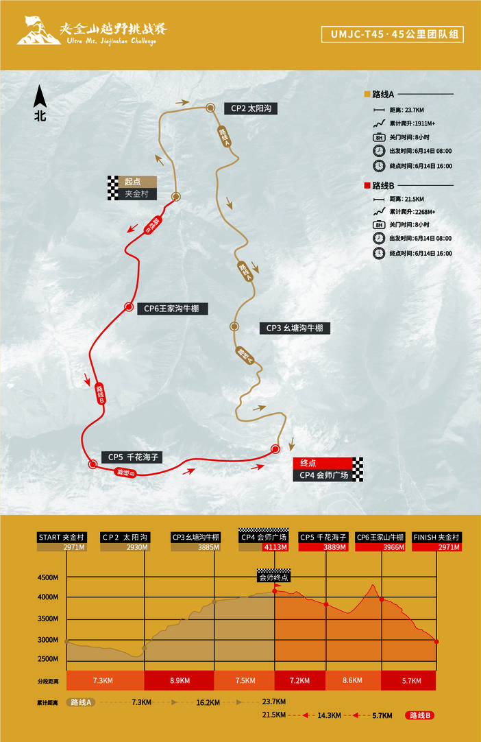 赛道简介:UMJC-TEAM 45 (45公里团队组)赛道全长45.2公里,其中A组线路长23.7公里,累计爬升1911米,累计下降762米,最高 海拔 4113米,赛道从夹金村出发,途径CP2太阳沟、CP3太阳沟到达CP4会师广场;B组线路全长21.5公里,累计爬升2268米,累计下降1119米,最高海拔4283米,赛道从夹金村出发,先后途径CP6王家山、CP5千花海子,在CP4会师广场和A组选手会师。