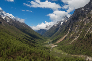 百万年来,冰期多次降临在四姑娘山,高山上的冰川不断的积累,在重力作用下就会开始向下滑动,形成呈一定宽度的“条状”冰川,就像一条巨大的“冰舌”从高山上铺下来,巨大的重量使得冰川在向下滑动的过程中对地面不断的进行侵蚀作用,大量地表物质被刨蚀裹挟到冰川里面,并被冰川向下推动到海拔较低地区。这一过程不断持续,最终在冰川消退融化后,在地表留下一个底面非常宽阔的“U”型谷,U型谷被流水不断深切,形成V型谷,它比U型谷显得更加深邃陡峭,山峰与谷底相对高差可达3500米,形成山高谷深的壮观景像。我们本次探秘的长坪沟就是四姑娘山地区典型的V形山谷。