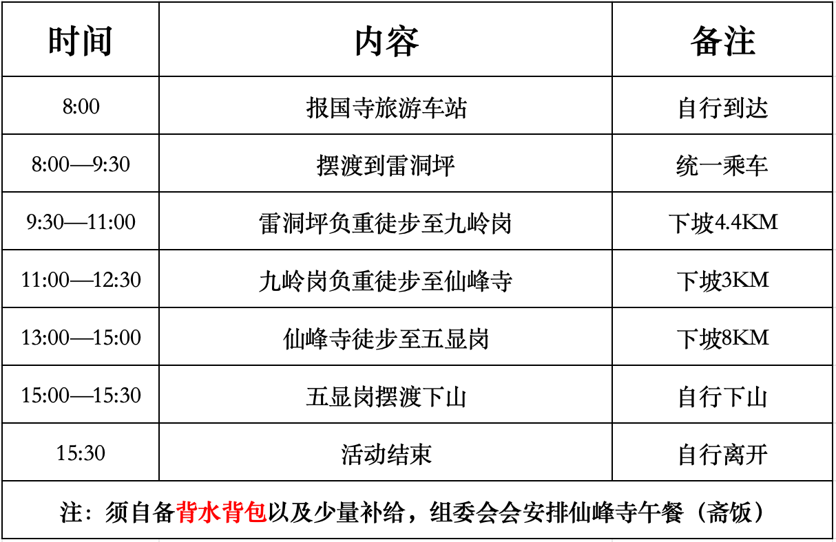 报名费用:免费,将为大家提供摆渡车(黄湾游客中心到雷洞坪,万年寺返程摆渡)、景区门票、保险、午餐、电子证书等相关福利。