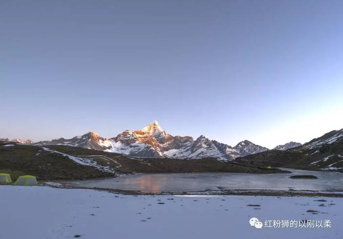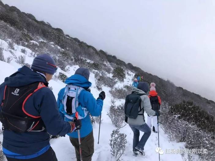 第二天起床,整座山被雪覆盖,下山难度增加,可是这点儿拉练对于户外经验丰富的队友都不算啥。