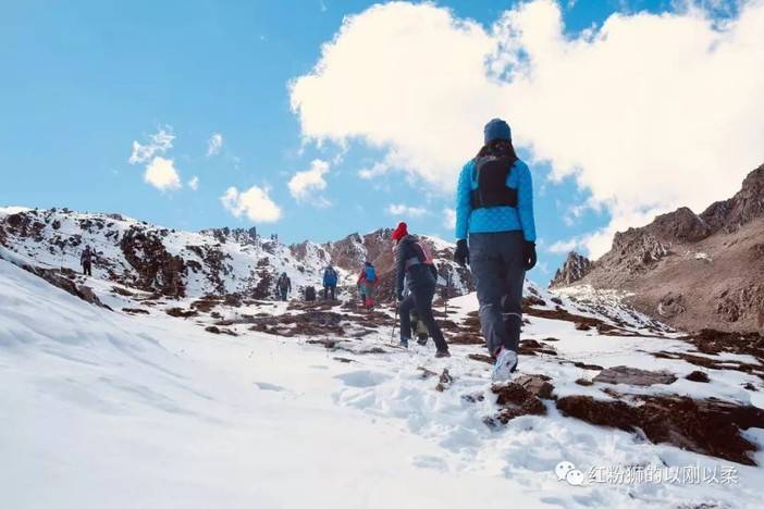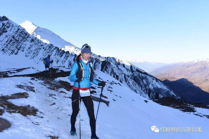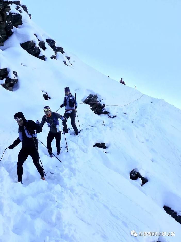 上过校长的课,校长的话我乖乖地听进去了,脚下的雪很厚很松软,但是并不滑,尽管左手边就是容易滑坠的山脊,但是不能被自己的心理假象吓到。即使滑倒,雪还比较厚,容易制动。一些有经验的跑友赛前也给我了些建议,一定要快速通过这个路段,越慢越怕。我套上冲锋裤,更加集中精力走脚下的每一步。