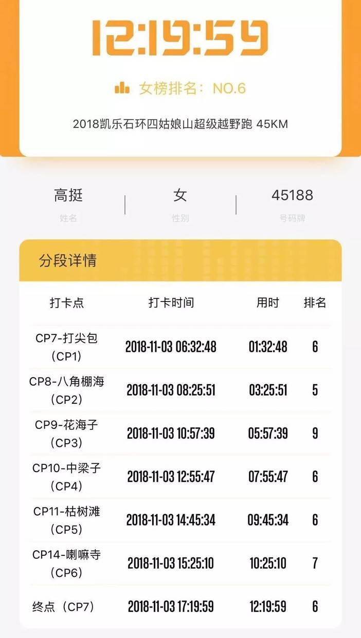 不知不觉到了中梁子CP4,只顾低头赶路,竟然没有看到四姑娘幺妹峰离自己那么近,景色如此之震撼,直到虎兄找到我的这张照片。中午12点55分,这个补给站有面有粥,完全在计划掌控内,就在这里午餐吧。拿出自己随身携带的小碗盛了点面,面微辣,但是没煮熟,又换了碗粥,不知道是红豆粥还是八宝粥,特别美味。给自己冲了包肌鲣强,这时后面有女生进站了,我还是撤了吧,下山跑起来。