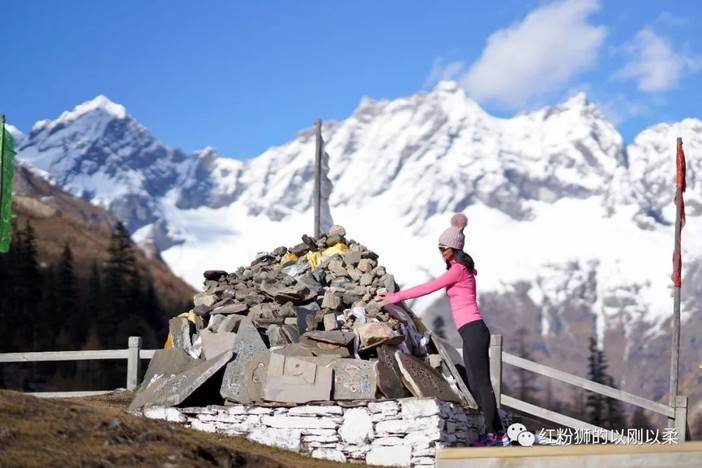 正午的阳光直射在脸上,特别的温暖,我就象一只爬升的乌龟,虽然慢,但是我不停歇,也就超了些人,途中遇到了100公里的喇叭裤,60公里的11。快到中午了,体力消耗了太多,我把随时携带的夏威夷果拿出来,一边爬升一边进补。突然有人叫“红粉狮”,原来是在亚丁同一个赛道相遇过并加了微信的马背小鲜肉,哈哈,我有个天生对于帅哥美女过目不忘的大脑,马上就认出了他。