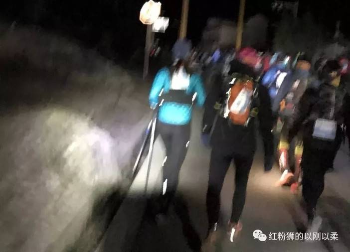 抬头满天星光,路上的头灯也汇聚成了流动的银河,大家都不语,在埋头赶路。起跑我比较靠中后,接着就是上坡,很多人上坡是大步走,作为中国女子马拉松记录的保持者孙英杰的弟子,我还是孙氏小步高频慢慢超人跑吧。头8公里是500米+的爬升,跑了一会儿上坡,浑身冒汗,我改为大步上坡走,边走边脱羽绒,换上冲锋衣,倒也没耽搁什么。TNF长白山结识的大连帅哥杨仔跟在我的后面,由于我溜缝跑,也许是因为我换衣服,一不留神把我跟丢了,但还是为我留下了宝贵的起跑上坡小步高频超人照片。同一跑团的虎兄虽然商量了一起跑,阴差阳错起跑后,再也没在赛道上相遇过。