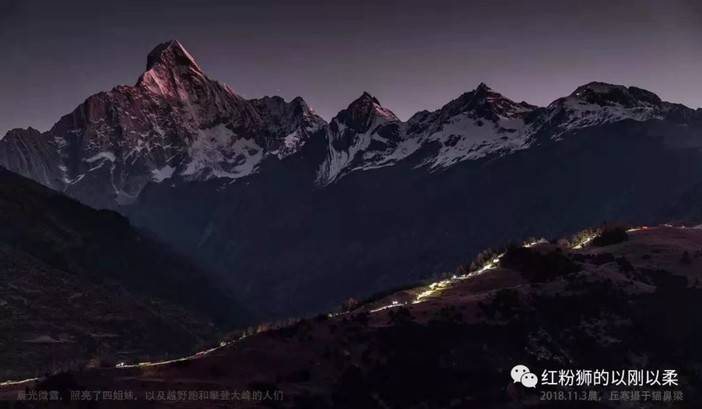 初跑越野很孤独,见天见地,在大自然中,和自己对话,找寻无数个为什么;渐渐地越野跑热闹起来,新老朋友,在比赛相逢,卸下铠甲,用原始的动力,来场你追我赶的较量。今年4月奔跑在4600米的亚丁天空,在摩梵认识了众多好友,11月相约奔跑在4600米的四姑娘天空。这是个超低完赛的赛事,必须要不停地奔跑,和自己较量,才能不被关门,欣赏到赛道全程的美景。