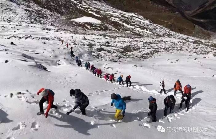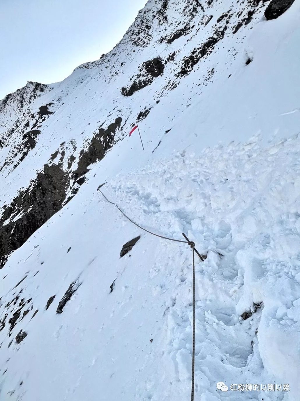 渐渐的雪越来越深,在最可怕的路段出现前我补了第2支能量胶,接着传说中可怕的危险山脊横切雪路现形了,领攀的曾校长站在第一个危险路段给大家加油,我问校长用穿冰爪吗?校长说,不怕,不用穿了。