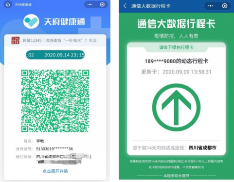 参赛运动员在报到时须佩戴口罩、检测体温并出示健康码。(省内选手需出示天府健康通绿码,四川省外地区选手需出示国务院客户端通行大数据行程卡),天府健康通和通行大数据行程卡示意: