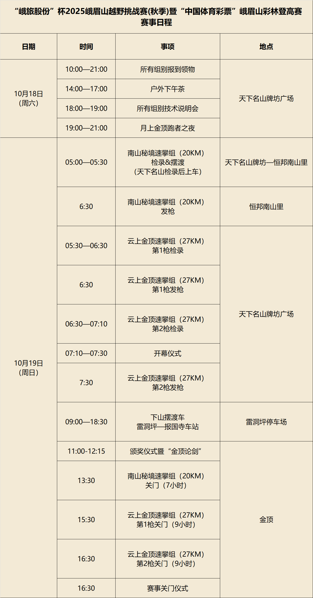 2025年4月18日—4月20日举办春季赛,设置“世遗文化亲子组”“春暖花开挑战组”“云上金顶速攀组”“南山秘境穿越组”“非遗仙踪越野组”“天下峨眉环山组”六个组别;2025年10月18日—10月19日举办秋季赛,设置“云上金顶速攀组”“南山秘境速攀组”两个组别。组别难度梯级设计,适合人群定位为:亲子徒步、大众跑步爱好者、从初级到资深不同级别的山地户外爱好者和越野深度跑者。为增加赛事趣味性及竞技,将推出速攀金顶组百强榜,并给予速攀金顶(男女前10)现金奖励,强化自我挑战,在奔跑中发现自己。同时,2025年计划开展全年线上速攀金顶排名活动,以及比赛期间第三方平台线上赛活动,并且围绕赛事路线开展亲子、研学、团建、露营等常规活动。