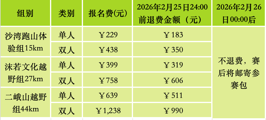 因不可抗力(含自然灾害、政府行政指令、公共安全事件等)导致赛事取消时:若在运动员报到前取消,组委会将在扣除不可撤销的运营成本后执行差额退费;若在赛事进行阶段取消或中止,报名费将不予退还,且不承担参赛者衍生经济损失(含差旅住宿等关联费用)。