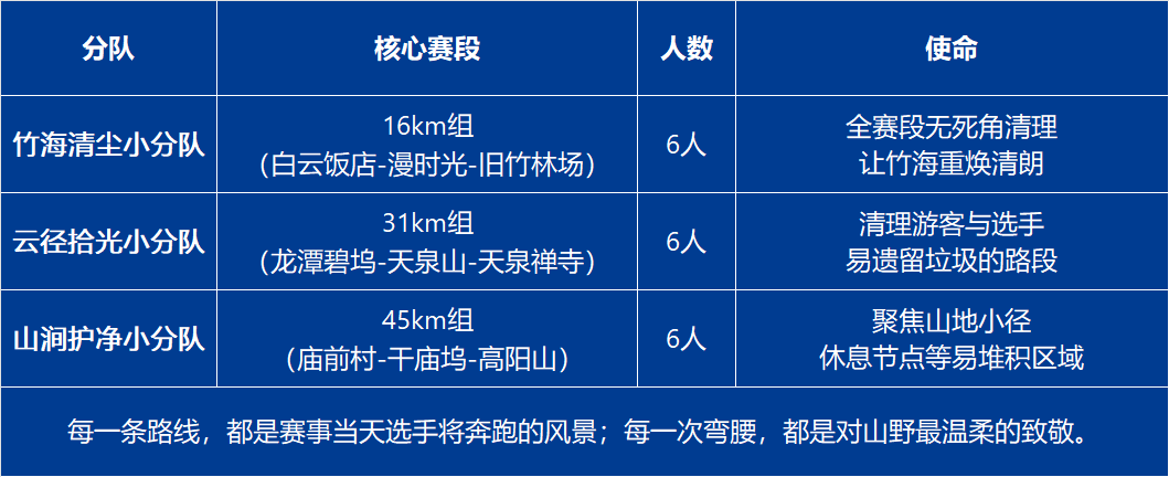 根据赛道特点与垃圾易堆积区域,我们将20位志愿者分为三支小分队,由组委会工作人员带队,总清理里程约28km: