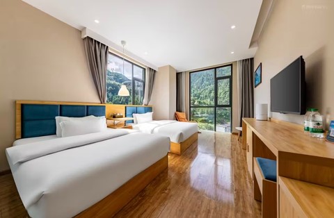 - 客房设施:房内配备地暖、暖气片、电热毯、多种规格电源插座、220V 电压插座、遮光窗帘、书桌、浴帽、牙刷、洗发水、瓶装水;房间有线频道、液晶电视机等,床具另备有毛毯:大厅配备电梯。